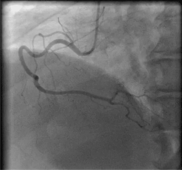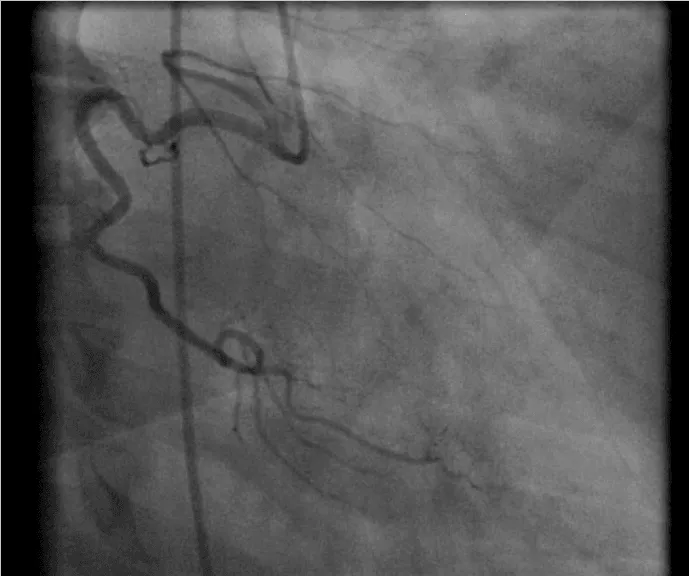 Her initial vital signs upon presentation to the hospital were; blood pressure: 161/76 mm Hg, heart rate: 96 beats per minute, respiratory rate: 27 breaths per minute. Physical exam revealed a cardiac auscultation findings of a grade 2 diastolic murmur which was loudest at the 2nd right intercostal space as well as a grade 2 systolic flow murmur. Cardiac biomarkers were elevated with initial troponin-I of 0.33 ng/mL, peak of 2.28 ng/mL and subsequent down trend. Electrocardiography (Figure 1) showed sinus rhythm with anterior and inferolateral T wave inversion and chest radiograph (Figure 2) was unremarkable. She underwent coronary angiography which revealed normal coronary arteries. The takeoff of the right coronary artery (RCA) was noted to be superior and anterior to its normal position (Figures 3A and 3B). Transthoracic and transesophageal echocardiography (TEE) revealed normal left ventricular systolic function and severe insufficiency of the aortic valve with Quadricuspid morphology (Figure 4A in Diastole, Figure 4B in Systole, Figure 4C Long Axis of the aortic valve). She underwent aortic valve replacement with a # 19mm ON-X mechanical valve. Intraoperatively it was noted that the ostium of the right coronary artery was over the aberrant leaflet. Her postoperative course was complicated by the development of supraventricular tachycardia, posteriorly localized pericardial effusion, severe hemolytic anemia, renal failure and pancreatitis leading to her death eleven days after the surgery.
