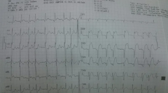 A 42 year old non-diabetic, non-hypertensive man was admitted to emergency department with chest pain continuing for 2 hours. Blood pressure and pulse rate were normal on physical examination of cardiovascular system. Electrocardiography revealed ST segment elevation in leads V1 to V4 (Figure 1). Echocardiography showed segmental wall motion abnormalities in anterior, anteroseptal and apical segments without any pericardial effusion. Laboratory analysis revealed elevated levels of Troponin I (39.6 ng/ml) and creatine kinase-myocardial band (24.5 ng/ml). He was transferred to coronary angiography unit for primary percutaneous intervention with the diagnosis of acute anteroseptal ST segment elevation myocardial infarction. Coronary angiography revealed a giant coronary artery aneurysm (20x40 mm in size) on the left anterior descending coronary artery (LAD). There was massive thrombus inside the aneurysm obstructing the distal coronary flow (Figure 2A). The circumflex and right coronary arteries were normal. Due to high thrombus burden and the lack of coronary blood flow distal to enurysm, thrombolytic therapy was administered with 10 mg intracoronary bolus and 90 mg intravenous infusion of tissue type plasminogen activator. A control coronary angiography after 12 hours showed partial lysis of the thrombus burden providing a TIMI III flow in the first diagonal artery. However there was TIMI 0-I flow in the distal LAD (Figure 2B and C). The co-decision of cardiology and cardiovascular surgery team was urgent surgery. However during the surgical preperation, the haemodynamic status of the patient failed. Echocardiography revealed that massive fibrinous pericardial effusion causing cardiac tamponade (Video 1). There was no sign of free wall rupture complicating acute myocardial infarction. Immediate pericardiosentesis yielded in 750 cc hemorrhagic fluid without any decrease in the pericardial effusion on echocardiography. Emergent chest opening by cardiovascular surgeon in the intensive care unit revealed the rupture of the giant coronary aneurysm. Soon after cardiac arrest occured before reconstruction of the LAD and the patient passed away after an unsatisfactory resusitation.