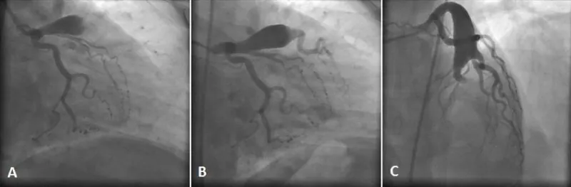 Figure 2: Coronary angiography revealed a giant coronary artery aneurysm (20x40 mm in size) on the left anterior descending coronary artery (LAD) with massive thrombus obstructing the distal coronary flow (A). Due to high thrombus burden and the lack of coronary blood flow distal to enurysm, thrombolytic therapy was performed with 10 mg intracoronary bolus and 90 mg intravenous infusion of tissue type plasminogen activator. A control coronary angiography 12 hours after thrombolytic therapy showed partial lysis of the thrombus burden providing a TIMI III flow in the first diagonal artery (B) and TIMI 0-I flow in the distal LAD (C).