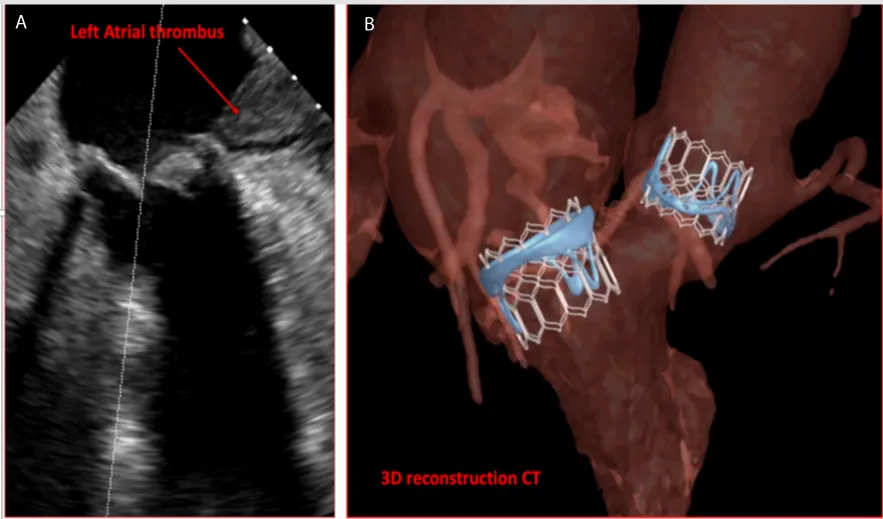 Figure 1: A: Tran’s esophageal echocardiography showing left atrial thrombus. B: 3 dimension cardiac computed tomography reconstruction with valve in valve implantation simulation.