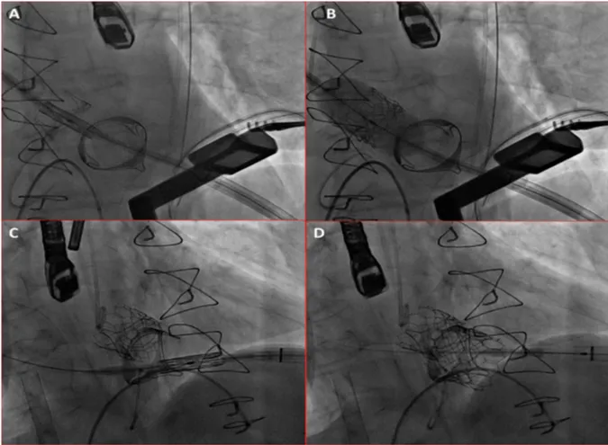 Figure 2: VIV procedure A: Trans aortic VIV positioning B: Tran’s aortic VIV deployment C: Trans mitral VIV positioning D: Tran’s mitral VIV deployment