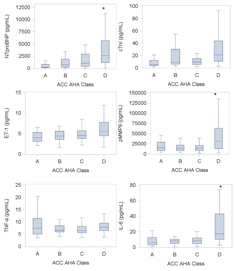 Continuous plasma concentrations of NTproBNP, cTnI, ET-1, pMMP-9, TNF-α, and IL-6 were measured across all ACC/AHA HF stages (Table 1). With the exception of TNF-α, there were significant correlations between HF severity and rising plasma concentrations of NTproBNP (p<0.0001), cTnI (p=0.0003), ET-1 (p<0.0001), pMMP-9 (p=0.0008), and IL-6 (p<0.0001). Additionally, post-hoc analyses were used to compare the plasma concentrations of the aforementioned biomarkers across varying stages of HF severity. Significant differences were observed between plasma concentrations of NTproBNP, pMMP-9, and IL-6 among individuals with ACC/AHA Class D HF in comparison to those measured among individuals with ACC/AHA Class A, B, and C HF (Figure 1). NTproBNP, cTnI, ET-1, pMMP-9, TNF-α, and IL-6 were also elevated during asymptomatic, early stages of HF.