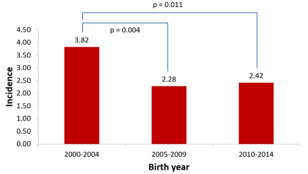 Figure 1: Comparison of incidence of CCHDs (including abortions) per 1000 live born in 5-year periods.