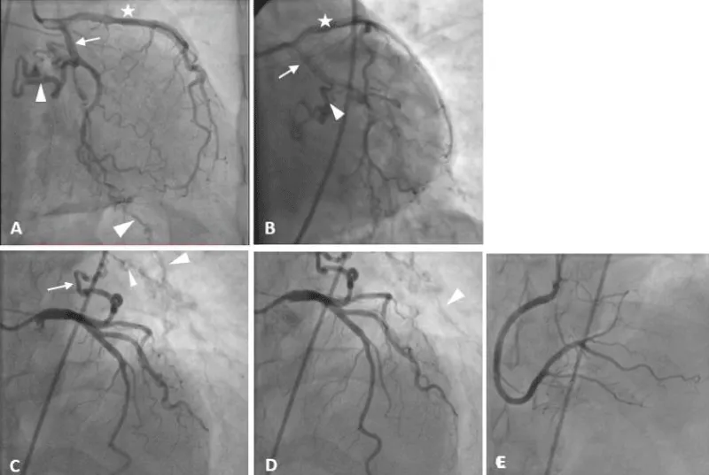 Figure 1: Percutaneous coronary angiography shows the anatomy of the coronary arteries. On A & B, the star refers to the left anterior descending artery, the arrow refers to the left circumflex coronary artery, and the arrow head refers to the abnormal branch of the LCX that continues to the intercostal arteries and the intercostal artery. C & D shows the course of the abnormal connection and the course of the intercostal artery. E shows the right coronary artery. Note that all coronary arteries have a patent lumen without stenosis./p>