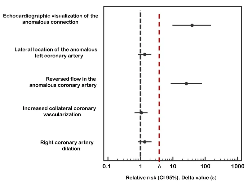 Table 1 illustrate the findings obtained by establishing the relationship between echocardiographic parameters and the diagnosis of the syndrome according to the quantification of risk estimators (incidence) and the respective confidence intervals in each of the variables studied. The results obtained indicate that the echocardiographic measurements that established the highest probability for the diagnosis of the syndrome were: the echocardiographic visualization of the anomalous connection, RR (39.00; 95% CI 9.88 to 153.97) and the reversed flow in the anomalous coronary artery, RR (26.31; 95% CI 8.62 to 80.33); while the lowest incidence for the echocardiographic diagnosis of the syndrome was seen in the lateralized location of the anomalous left coronary artery, RR (1.37; 95% CI 0.86 to 2.18); increased collateral coronary vascularization, RR (1.07; 95% CI 0.67 to 1.69); and right coronary artery dilation, RR (1.35; 95% CI 0.85 to 2.21).