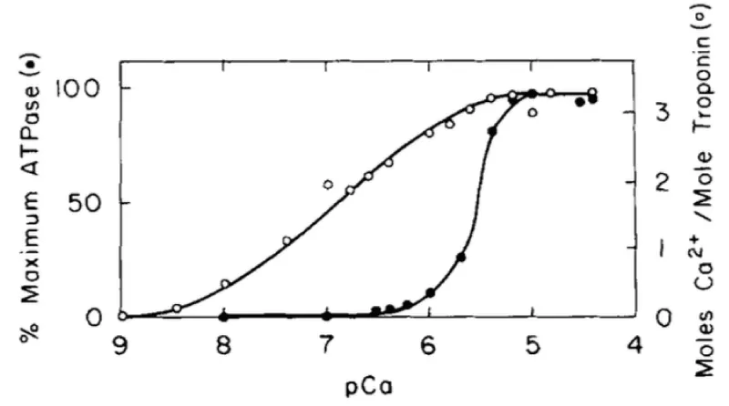 Figure 2: Comparison of Ca2+ activation of the cardiac myofibrillar ATPase and Ca2+ binding to cardiac (cTnC) in the presence of 4 mM Mg2+. (○) and the dependence of the myofibrillar ATPase activity on free (Ca2+) (●), from Holroyde, [1].