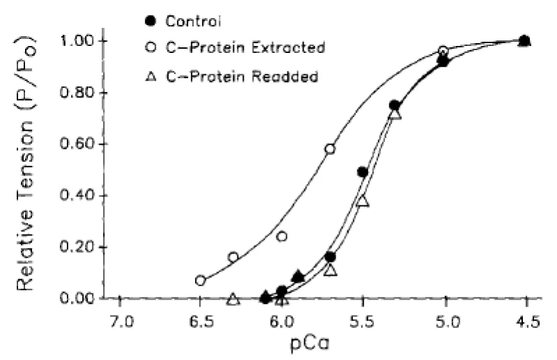 - Hofmann PA, Hartzell HC, Moss RL. Alterations in Ca2+ sensitive tension due to partial extraction of C-protein from rat skinned cardiac myocytes and rabbit skeletal muscle fibers. J Gen Physiol. 1991; 97: 1141–1163. PubMed: https://www.ncbi.nlm.nih.gov/pubmed/1678777