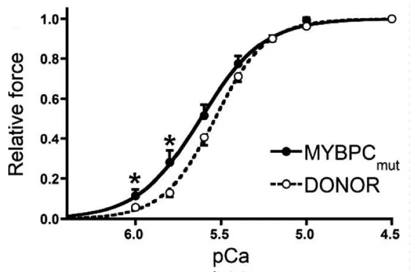 The shift to lower [Ca2+] and loss of cooperativity was accompanied by considerable loss of contraction strength, however this does bypass the cMyBP-C substrate control and the linkage is not floppy as with DCM mutations in light chain, see later.
