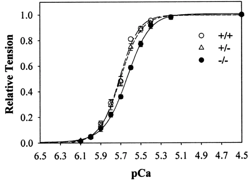 Figure 9: Ca2+ sensitivity of tension in skinned myocytes from cMyBP-C-nul mice. wild-type (+/+), heterozygous (+/−), and homozygous (−/−) knockout, from Harris, et al. [13].