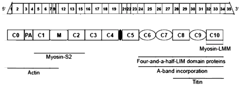 Figure 11: Schematic representation of cMyBP-C mRNA and protein structure and its interaction partners from Carrier, et al. [16].