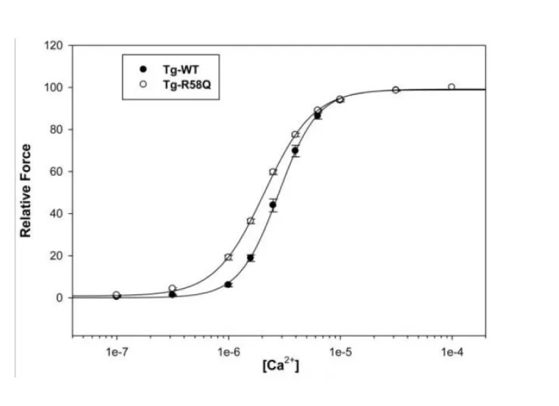 Figure 14: The effect on Ca2+ sensitivity of force determined in Tg-R58Q glycerinated skinned papillary muscle fibers compared to Tg-WT, from Mettikolla, et al. [18].