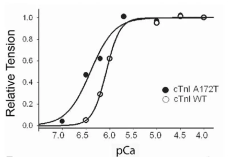 There are reports of restrictive cardiomyopathy (RCM) showing major loss of Ca2+ cooperativity arising from mutations mostly in cTnI. RCM is a more pronounced form of HCM. Two examples are given here, both from Davis, et al. (Figures 16,17).