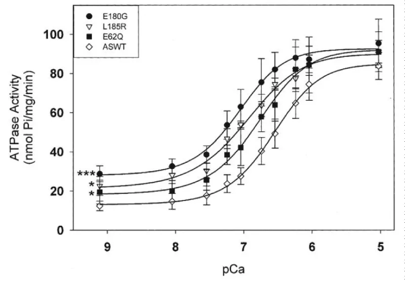 Figure 15: Activation of actin-Tm-activated myosin ATPase activity by either WTHCTnI or HCTnIR145G, dependence on Ca2+, from Lang, et al. [19].