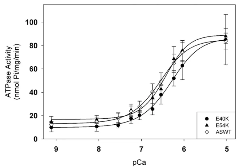 Figure 22: Effects of HCM-causing ∝-Tm mutations on the Ca2+-dependent myofibrillar ATPase activity rates. Chang, et al. [40].