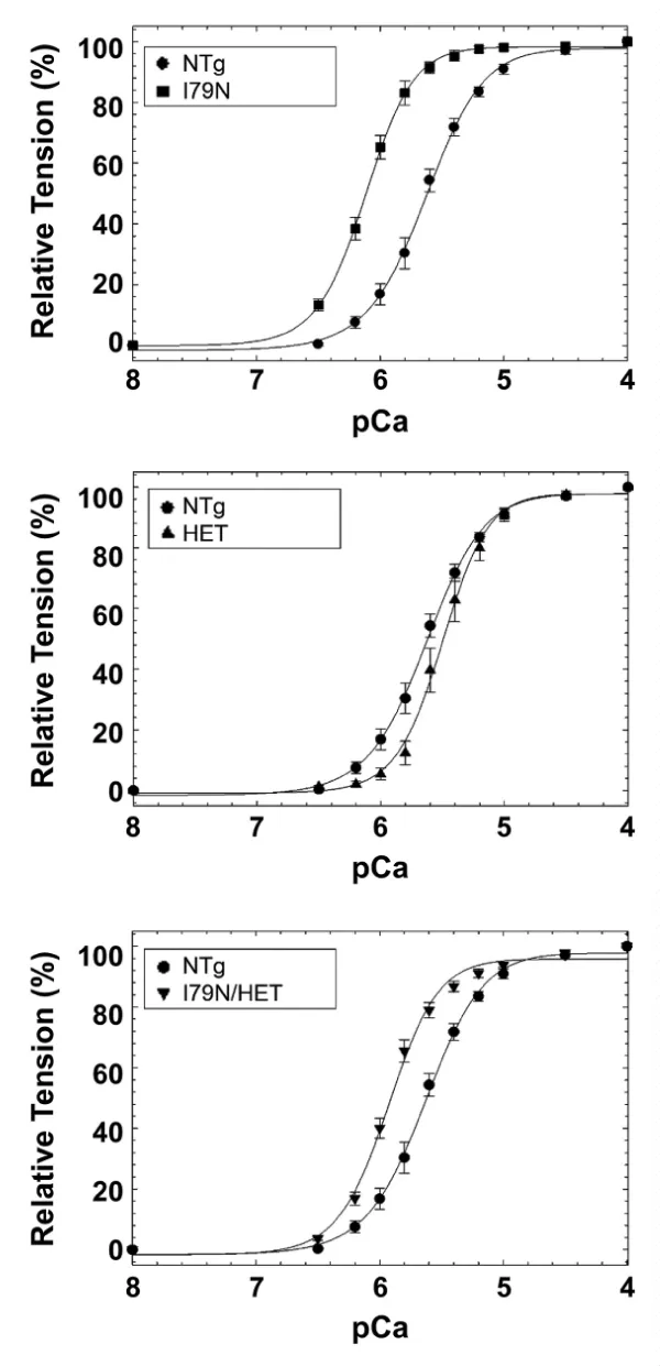 Figure 27: Calcium-dependent tension of, A, I79N mice compared to NTg. B, R141W HET mice compared to NTg. C, I79N/HET mice mutually normalized the Ca2+ sensitivity towards WT, from Jones, et al. [48].