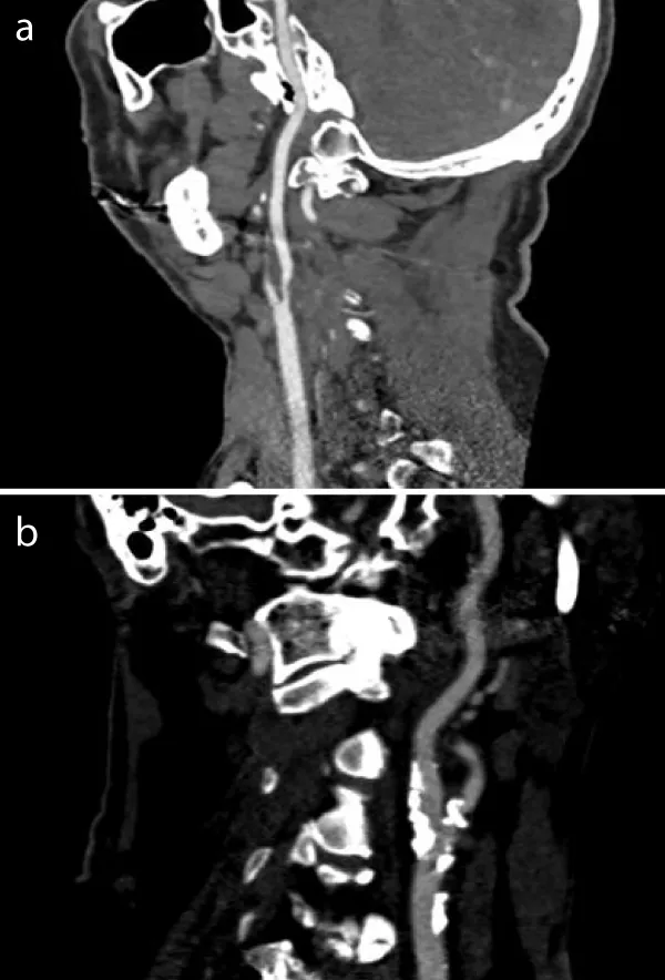 The CT angiography of a patient with hard plaque also shows high-grade internal carotid stenosis due to calcifying plaques. There is hardly any evidence of hypodense internal plaques. A small hyperdensely contrasted lumen with extensive, bizarre, fissured calcifications, sometimes with adjacent hardening artefacts, is shown (Figure 1b).