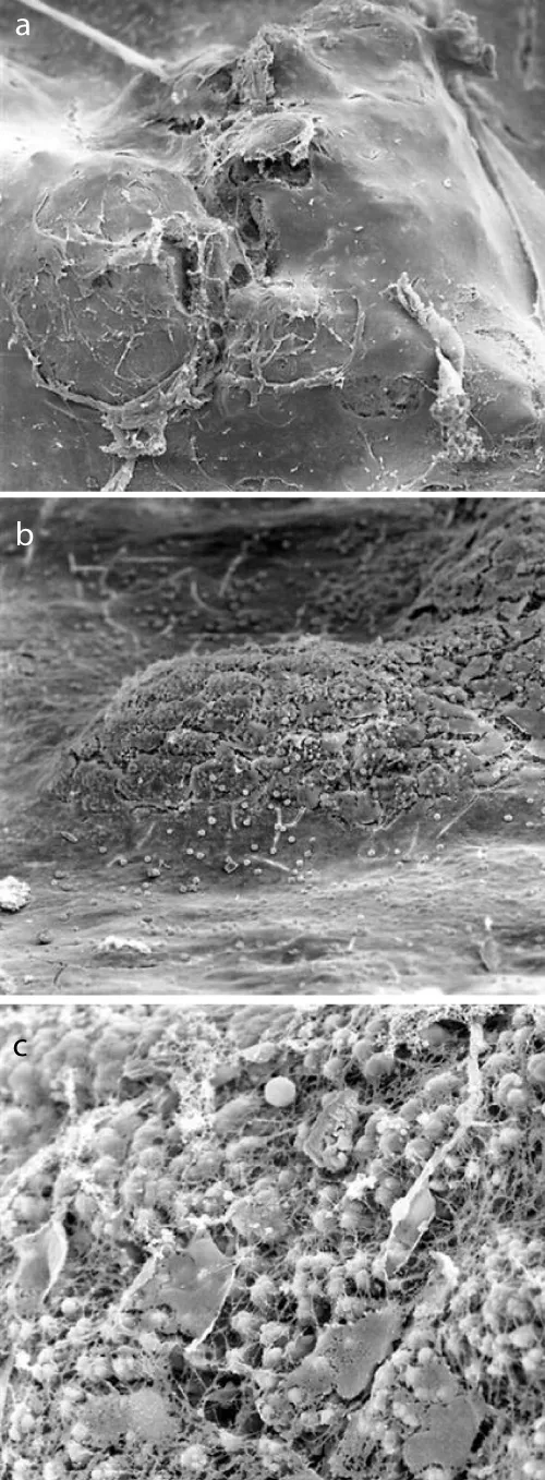 Figure 2: a: Scanning electron microscopical findings of internal carotid plaque (50 x magnification): the surface of the observed plaques was uneven and partially broken. b: Scanning electron microscopical findings of internal carotid plaque (200 x magnification): multiple initial tearings and the uncovered extracellular matrix. c: Scanning electron microscopical findings of internal carotid plaque (1000 x magnification): incorporation of erythrocytes into the extracellular matrix with partially thin layer of endothelial cells.