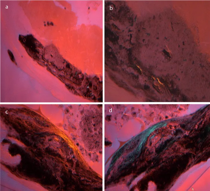 Polarised light microscopy enabled) a distinction between two different types of plaques. In transmitted plane light, the collagenous fibers as well as intravascular deposits were transparent. Using a hilfsobject red 1st order, deposits looked lucent (Figure 3a,b). When unstained thin ground sections of pathologically altered samples of the second group were viewed in transmitted plane light, the intravalvular localized inhomogeneous inclusions appeared as a secondary substance of yellowish or blue color (Figure 3c). In regular light, the character of this substance could be described as fibrous resembling natural woven bone. At high magnification (620 x), bundles of collagen fibers were detected (Figure 3d).