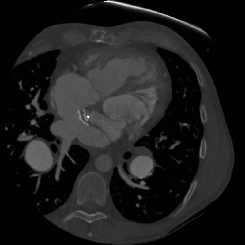 Figure 1: CT image demonstrating heavily calcified pulmonary venous baffle. Calcification is heaviest on the baffle’s anterior aspect at the level of the systemic and pulmonary venous baffle crux.