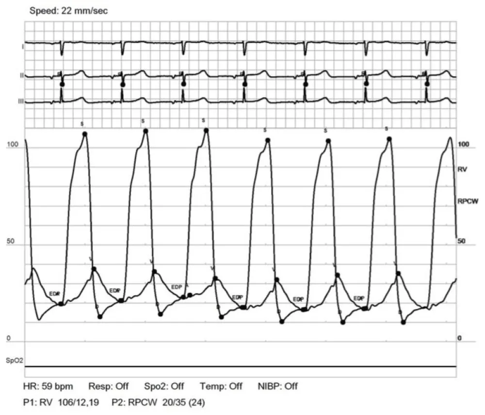 Figure 2: Simultaneous RV and PCWP tracing for patient 2. Tracings demonstrate A wave pressure that correlates with RVEDP and a very large V wave.