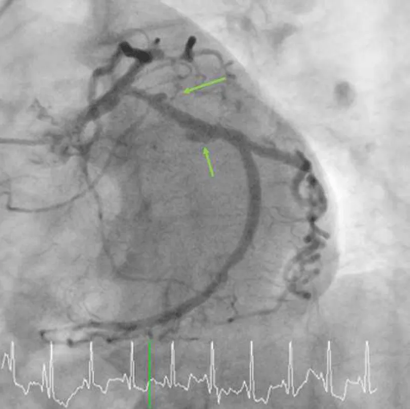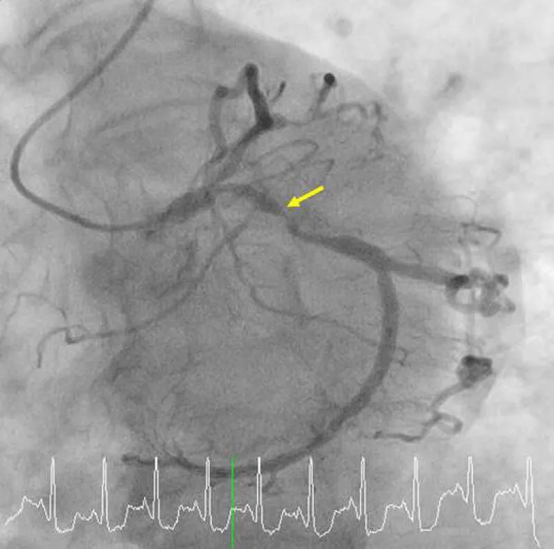 Figure 1A: A diagnostic angiogram and PCI in 2009 and a follow-up angiogram in 2015. A baseline angiogram using a 4-Fr Judkins diagnostic catheter via transradial access shows a focal 90% blockage (yellow arrow) at the dominant proximal LCx.