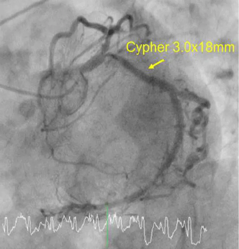 Case summary: A 75-year-old woman presented with new-onset effort angina. A coronary angiogram revealed a 90% blockage of the distal left main trunk (LMT) and a 99% blockage of the ostial left anterior descending coronary artery (LAD). A 3.0 × 18-mm CYPHER™ the stent had previously been implanted into the dominant proximal circumflex artery (LCx) in 2009 because of unstable angina. The patient developed pulseless ST elevation myocardial infarction after the withdrawal of antiplatelet therapy before a scheduled CABG. The patient recovered with VA-ECMO and PCI using aspiration thrombectomy and urgent CABG.