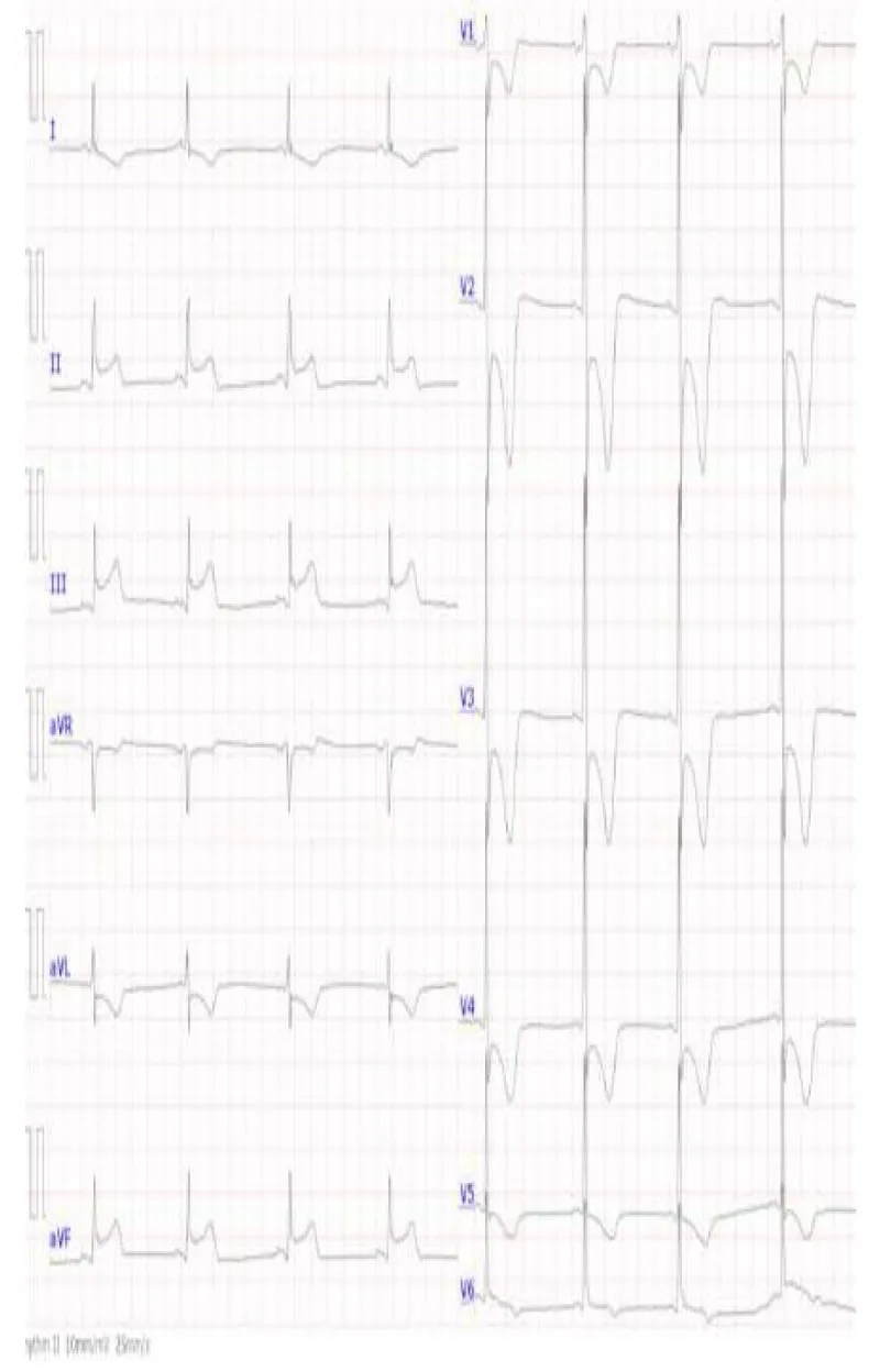 Figure 2: A 12-lead EKG at the initial presentation. ST elevations were noted at posteroinferior leads while the patient started complaining of chest pain in the general ward. At this point, the blood pressure was 69/37 mmHg. Five minutes later, the patient became unconscious and pulseless. EKG, electrocardiogram.