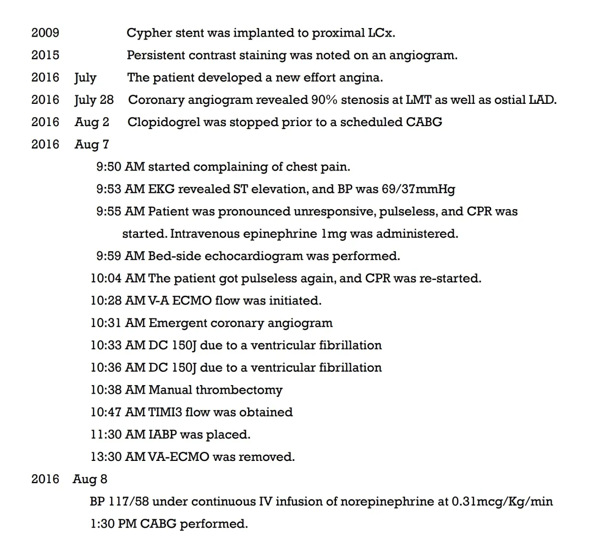 Abbreviations: STEMI: ST Elevation Myocardial Infarction; CABG: Coronary Artery Bypass Grafting; CPR: Cardiopulmonary Resuscitation; EKG: Electrocardiogram; LCx: Left Circumflex Artery; LAD: Left Anterior Descending Artery; LVEF: Left Ventricular Ejection Fraction; PSS: Peri-Stent Contrast Staining; VA-ECMO: Venoarterial Extracorporeal Membrane Oxygenation; VLST: Very Late Stent Thrombosis; L: Left Ventricular