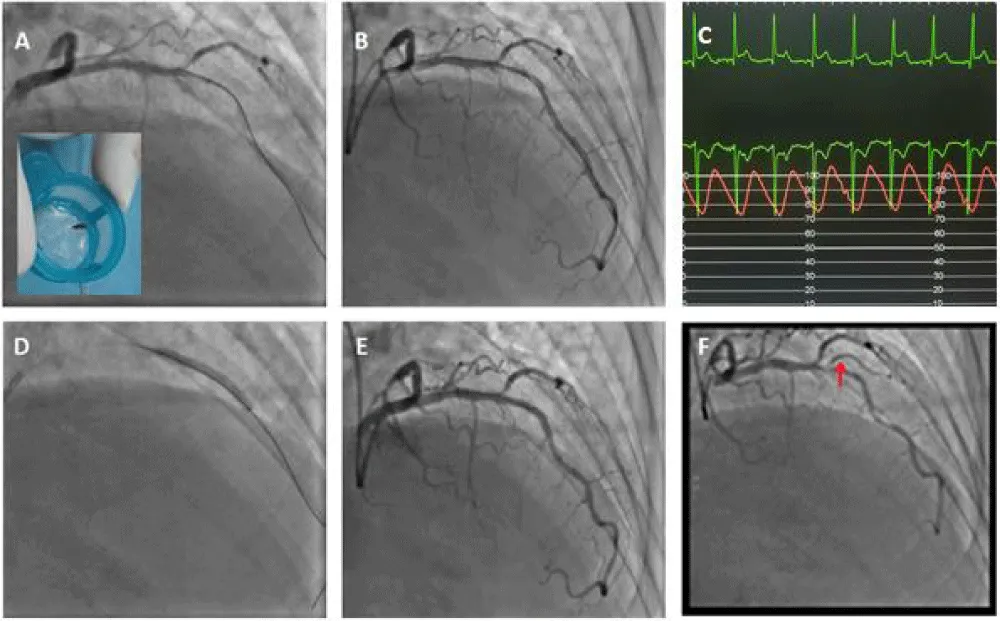 Figure 6: Management of the thrombotic occlusion of the LAD and result (A: Thrombectomy and balloon. B: result. C: ST regression. D: Stenting DES 2.75x28. E: Final result. F: Diagonal before PCI).