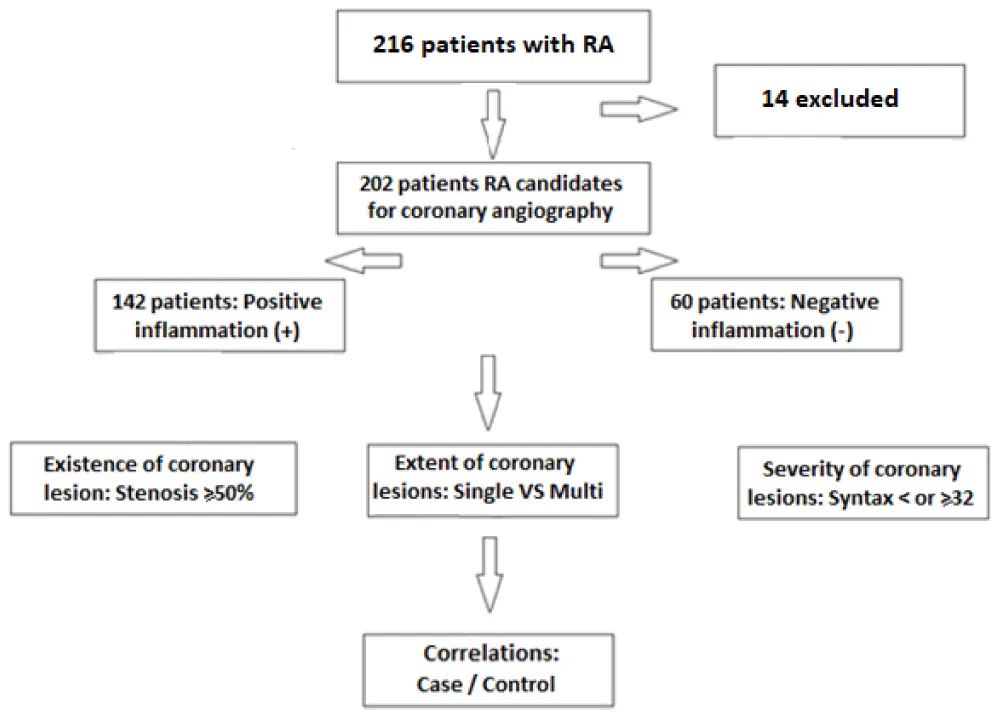 Method: This observational, retrospective, single-center study, including over 10 years, of patients with rheumatoid arthritis, confirmed the EULAR 2010 criteria and presented with coronary artery disease requiring coronary angiography. Patients with missing data or in whom coronary angiography was not done were excluded (n = 14). We divided then the patients according to the existence or not of chronic inflammation to study the impact of the latter on the existence (Stenosis < 50% vs. stenosis ≥ 50%), the extent (single vs. multivessel disease), and the severity of the coronary lesions (syntax score < 32 vs. ≥ 32).