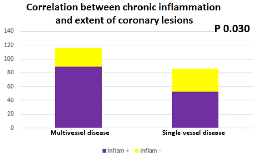 Chronic inflammation, apart from any influence of the various risk factors predisposes to the existence and extent of coronary lesions (p < 0.05). The severity of coronary lesions assessed by Syntax Score was not correlated with chronic inflammation, although other studies suggest that this inflammation is the cause of complex lesions.