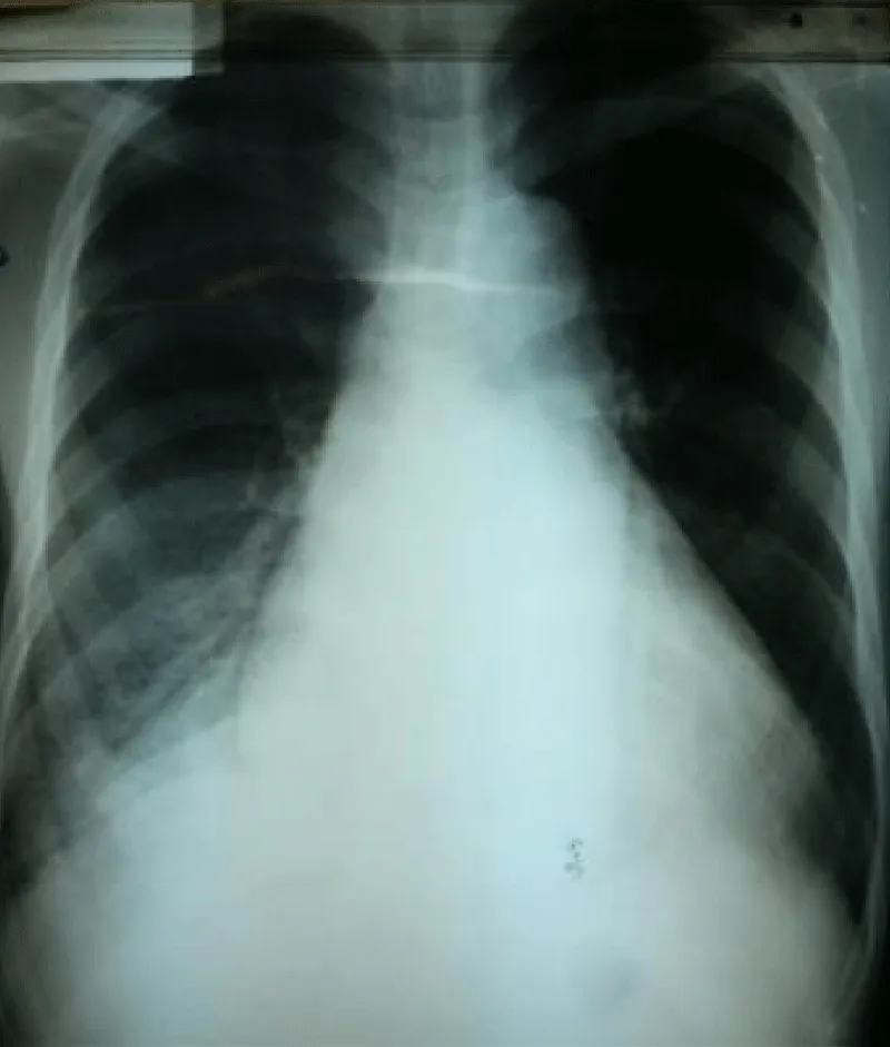 Figure 1: Frontal chest x-ray showing global cardiomegaly with signs of cardiac lung and enlargement of the upper mediastinum with overhang of the right upper arch.
