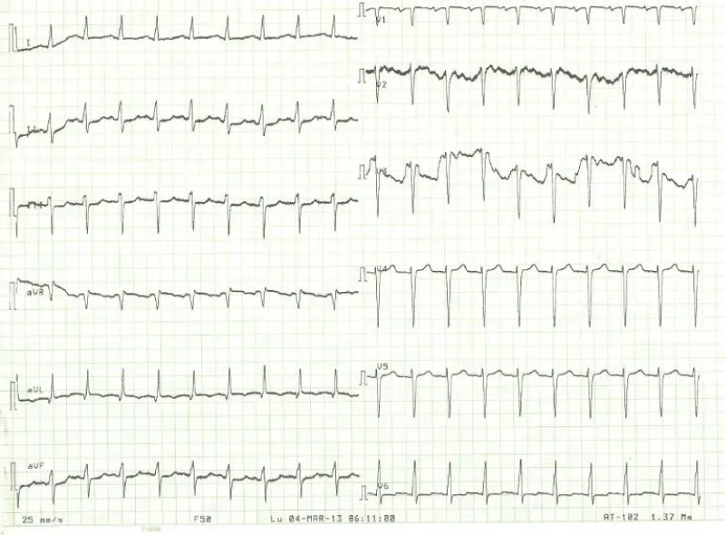 Figure 2: 12-leads electrocardiogram with sinus tachycardia, no R-wave progression in the antero-septal.