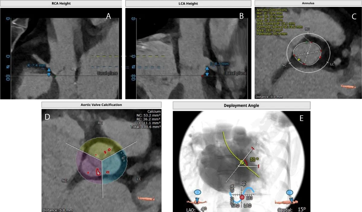 Figure 1: Computed Tomography images shows- A) Right coronary artery height, B) Left coronary artery height, C) Aortic annulus area, D) Aortic valve calcification and E) Deployment angles.