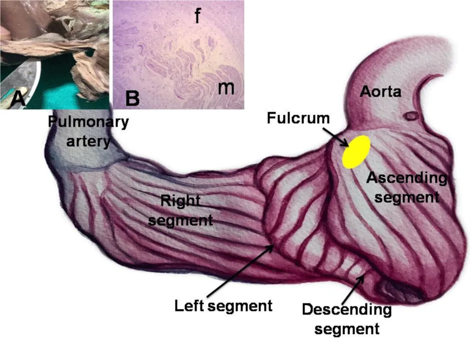 Figure 1: This figure shows the continuous myocardium arrangement at the beginning of its unfolding. The pulmonary artery and the right segment have been separated from the fulcrum in order to indicate its intermediate location between the right segment (anterior location) and the ascending segment (posterior location). A: Macroscopic view of the fulcrum in an adult human heart. B: Microscopic view of the human fulcrum. Note the myocardial fibers inserting into the tendinous fulcrum matrix.