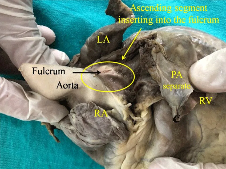 Figure 2: Adult human heart. The ascending segment is seen inserting into the cardiac fulcrum. References: LA: Left Atrium; RA: Right Atrium; PA: Pulmonary Artery; RV: Right Ventricle.