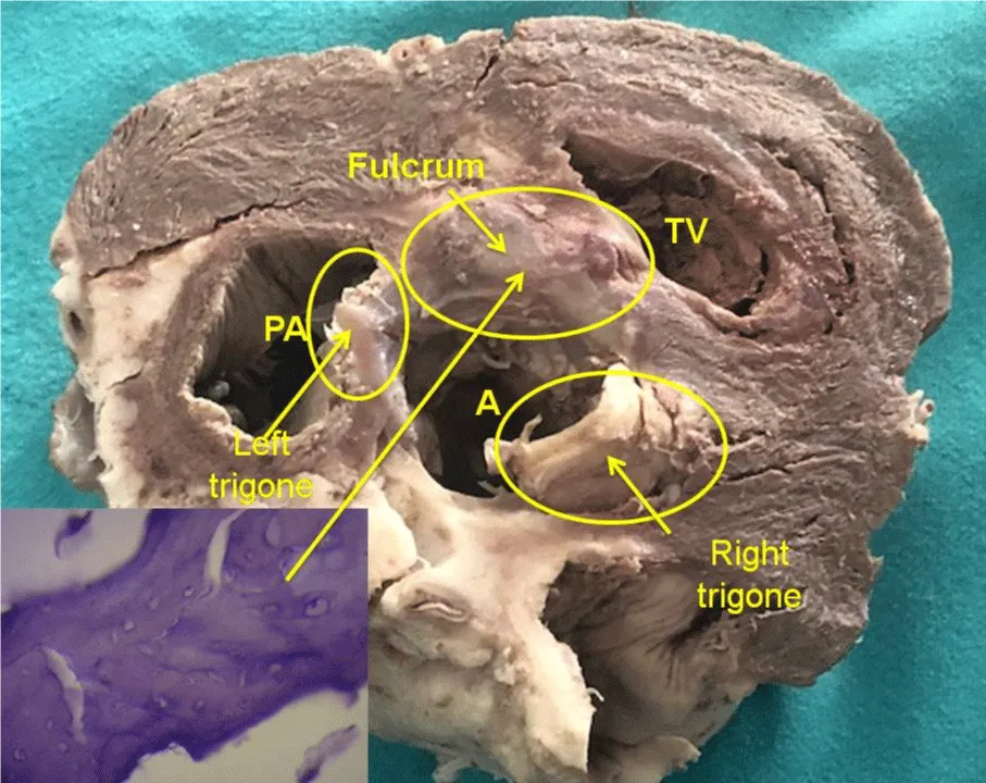 From this experience, fundamental questions arise: why have we found that in fetus, infant, child, and adult human hearts the cardiac fulcrum has cartilaginous characteristics, beyond it fulfills the same function of attaching the helical myocardium that other species have? Let us bear in mind that the cartilage is the substrate for endochondral ossification, and although it does not always ossify, it is necessary to that end. Our interpretation is that perhaps the cardiac fulcrum with an osseous characteristic -as observed in bovids- is a vestigial organ typical of the evolution of mammals. A vestigial structure must be understood as the preservation during the “evolutionary” process of genetically established attributes that have lost all or part of their ancestral function in certain species. In this case, the osteo-cartilaginous histology identified in bovids refers to a cartilage-tendinous matrix that is sufficient to achieve myocardial insertion and attain a muscle power that is much lower than that of larger mammals [12,13]. Let us recall that in this investigation, the bovid fulcrum is of osseus nature.