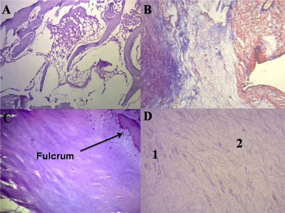 Figure 4: Histology of cardiac fulcrum. A: Mature trabecular bone forming the cardiac fulcrum tissue (bovine heart). Hematoxylin-eosin stain (10x). B: Cardiac fulcrum in a 23-week gestation human fetus showing prechondroid bluish areas in a myxoid stroma. Masson’s Trichrome Technique (15x). C: Central area of the fulcrum formed by chondroid tissue in a10-year-old human heart. Hematoxylin eosin- technique (15x). D: Festooned colagenous bands integrating the fibrotendinous matrix of the fulcrum (adult human heart). Hematoxylin-eosin technique (15x). 1: Remnants of atrophic cardiomyocytes. 2: Fibrotendinous matrix.