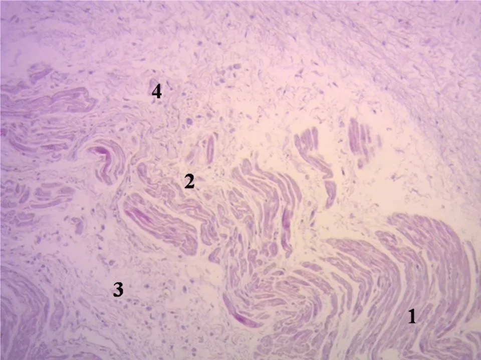 Figure 5: Festooned cardiomyocytes penetrating the fibrocollagenous matrix. (Cardiac fulcrum). Adult human heart. Hematoxylin-eosin technique (15x). 1: Fibrocollagenous matrix. 2: Cardiomyocyte fraying. 3: Atrophic cardiomyocytes. 4: Festooned cardiomyocytes.