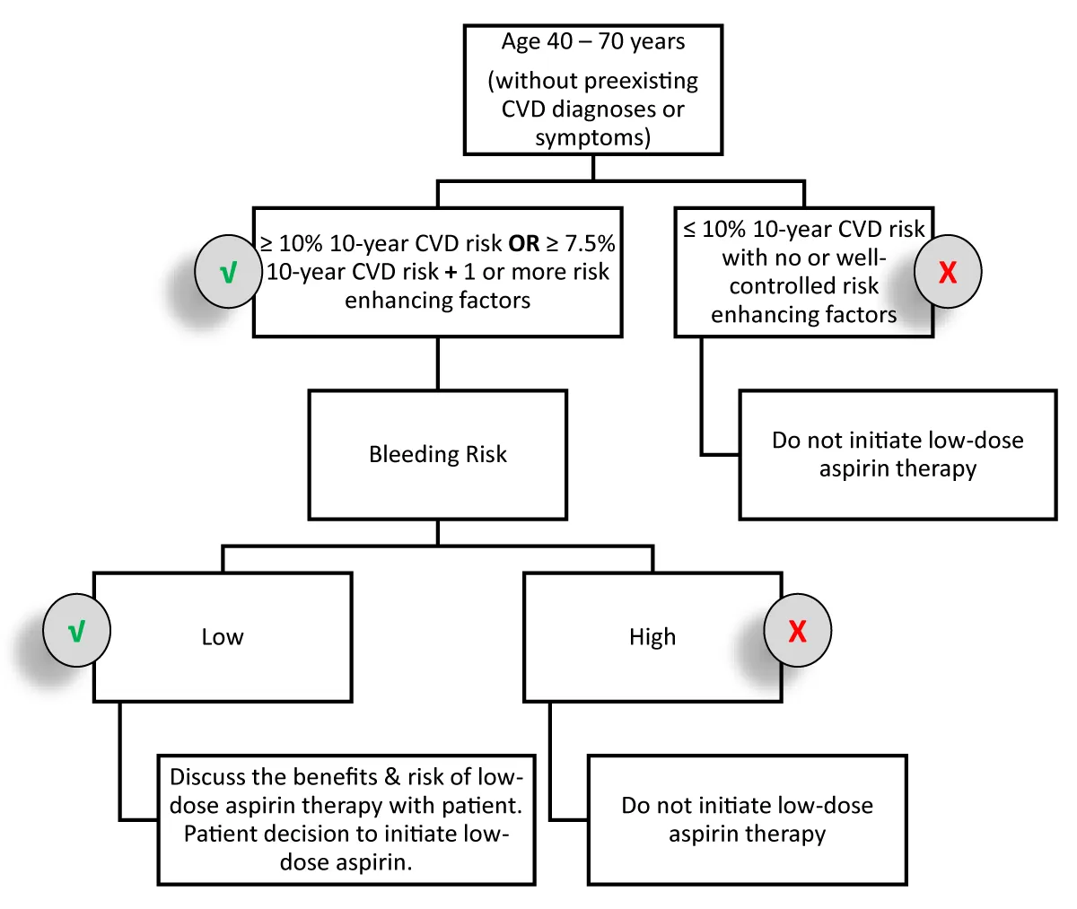 Recent advancements in the field of primary CVD prevention have identified the potential benefits of low-dose aspirin in appropriately selected individuals, a consensus ratified by authoritative organizations such as the American College of Cardiology and American Heart Association (ACC/AHA), along with the U.S. Preventive Services Task Force (USPSTF). In clinical application, healthcare practitioners must assume a pivotal role in orchestrating personalized, nuanced, and comprehensive risk assessments, encompassing a meticulous evaluation of both CVD and bleeding risks to determine the patients who may benefit from aspirin therapy. Moreover, the clinician should conduct meaningful conversations with these patients to clearly explain the benefits and risks of aspirin use and ensure a patient-centric decision to initiate aspirin therapy. Ongoing monitoring of the patient’s CVD and bleeding risks, as well as changes to medications, should be conducted throughout the patient’s care to optimize preventive care.