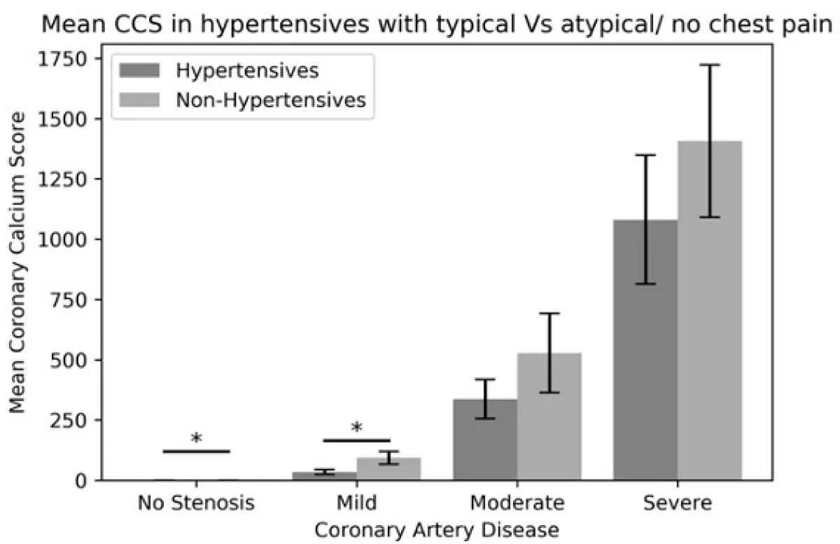 To further narrow down the pathway, we analysed the data to assess the CCS in hypertensive patients with typical chest pain against how many with atypical chest pain or no chest pain had significant CAD on CTCA. The data has shown that hypertensive patients with a high CCS were associated with a higher incidence of severe CAD independent of the presence or absence of stable chest pain. The data has also shown that the higher the CCS in hypertensive patients, the higher the risk of severe CAD, as compared to non-hypertensives, regardless of chest pain presentation. Consequently, a high CCS in the absence of hypertensives poses a lower risk of severe disease. These results suggest that hypertension remains the distinguishable factor and the strongest independent predictor for severe CAD and that those with hypertension, regardless of chest pain presentation, may benefit from alternative or concurrent functional investigation to better distinguish flow-limiting from non-flow-limiting CAD, depending on the treatment algorithm employed.