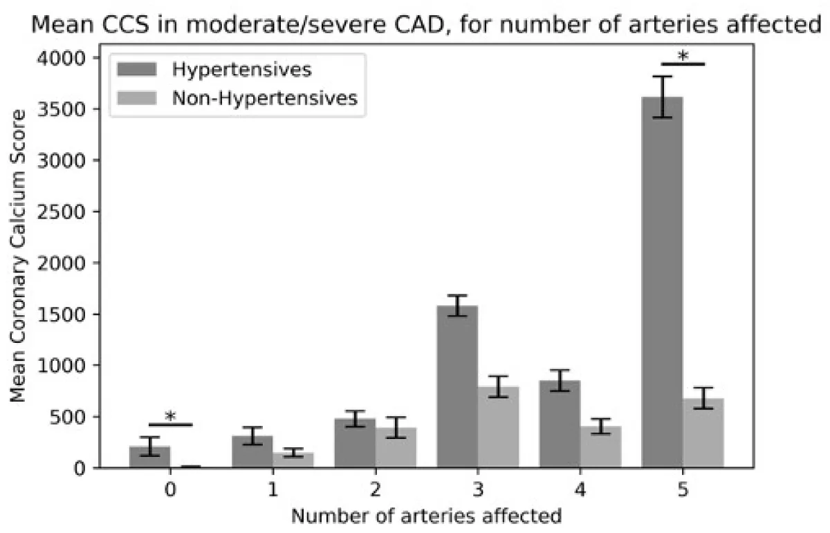 A higher number of affected coronary arteries correlated with a higher mean CCS and a significant difference in CCS was observed between hypertensives and non-hypertensives for the number of arteries affected (Table 6, Figure 5). Similar results were observed when comparing mean CCS in moderate-severely affected coronary arteries (Tables 6,7 Figure 6).