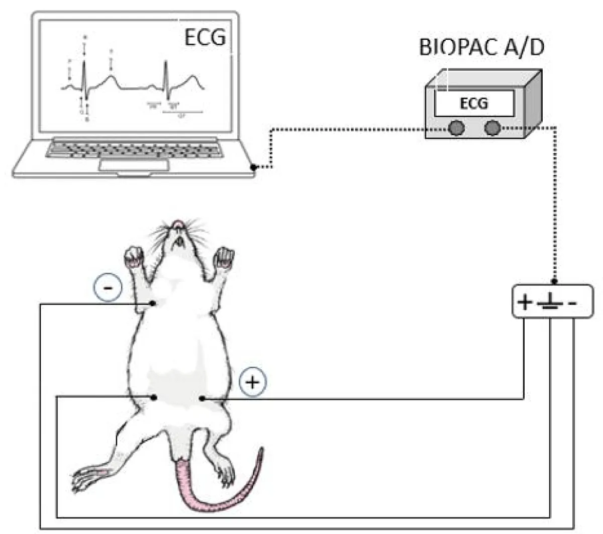 To obtain an Electrocardiogram (ECG) record, the animals, after chronic exposure (at least 100 days) to ethanol, were anesthetized with Isoforine® (isoflurane) (4.0% induction and 1.5% maintenance) and kept in a dorsal decubitus. The electrodes were placed in the D2 lead position (the positive electrode on the left lower limb, the negative electrode on the right upper limb, and the reference electrode on the right lower limb). The signal was recorded for fifteen minutes, acquired by the Biopac A/D system (MP100 System; BIOPAC, CA, USA), and connected to the Aknology program. Data were analyzed and processed using the MatLab program (Mathworks, Natick, MA, USA). Figure 1 represents the measurement procedure performed [12].