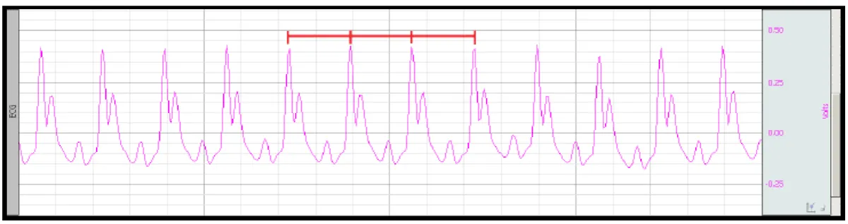 Figure 2: ECG obtained in the D2 lead and the RR interval (red markings) for quantification of arrhythmias [12].