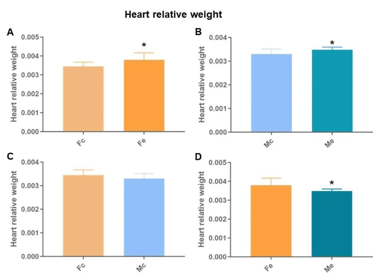By normalizing the total heart weight (mg) by body weight (mg) (cardiac index), we found differences between females (Figure 3A), males (Figure 3B), controls (Figure 3C), and exposed (Figure 3D). The Fe and Me had the highest heart relative weight with Fe being larger than Me.