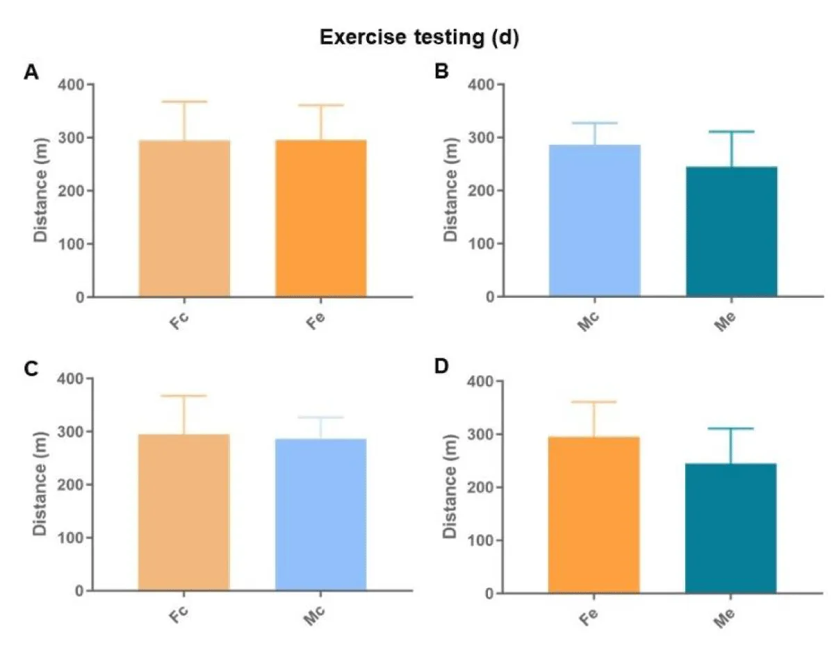 Figure 4: Total distance walked during the exercise testing. A: comparison between females; B: comparison between males; C: comparison between controls; D: comparison between exposed (p < 0.05*).