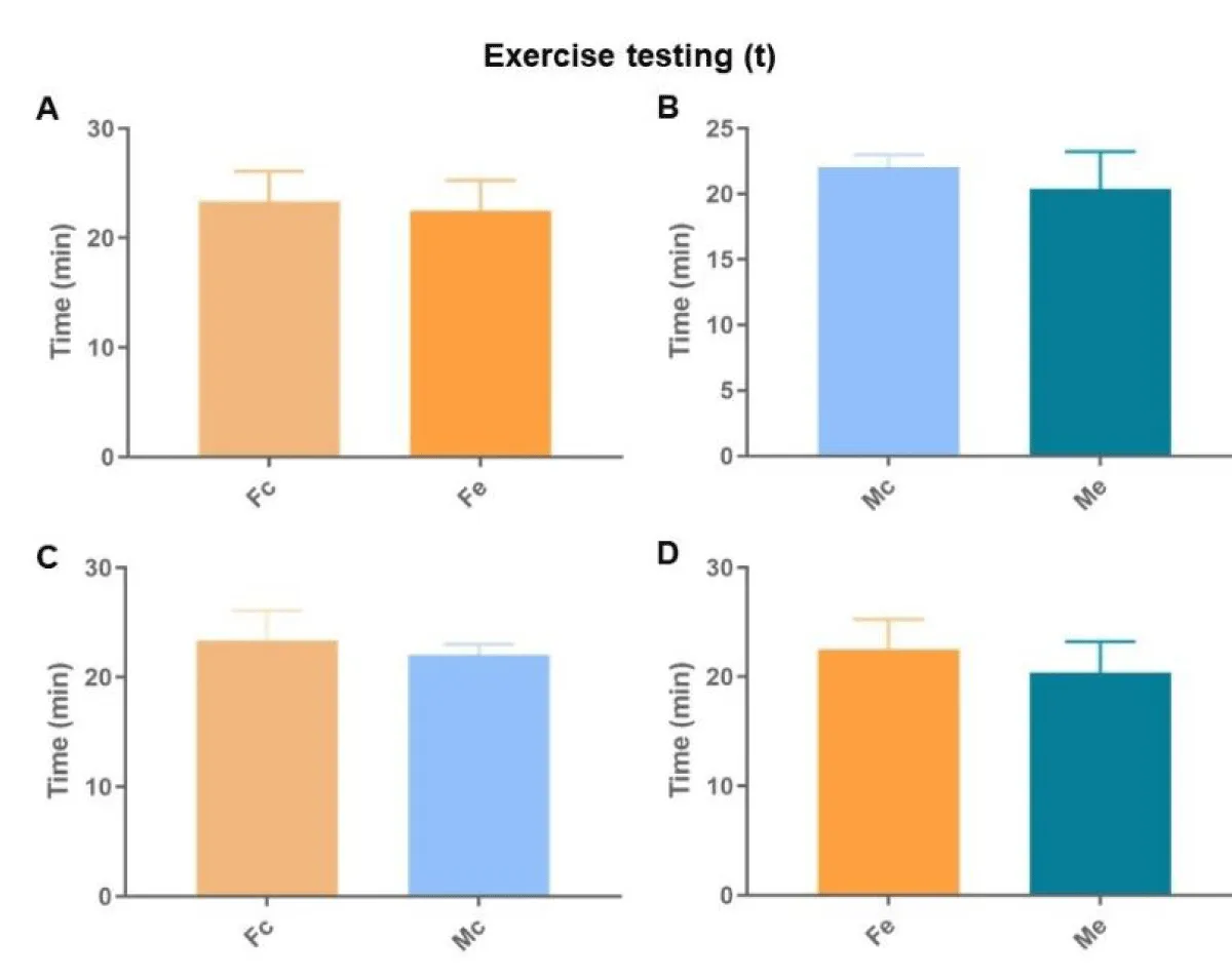 Figure 5: Duration in minutes of the exercise testing. A: comparison between females; B: comparison between males; C: comparison between controls; D: comparison between exposures (p < 0.05*).