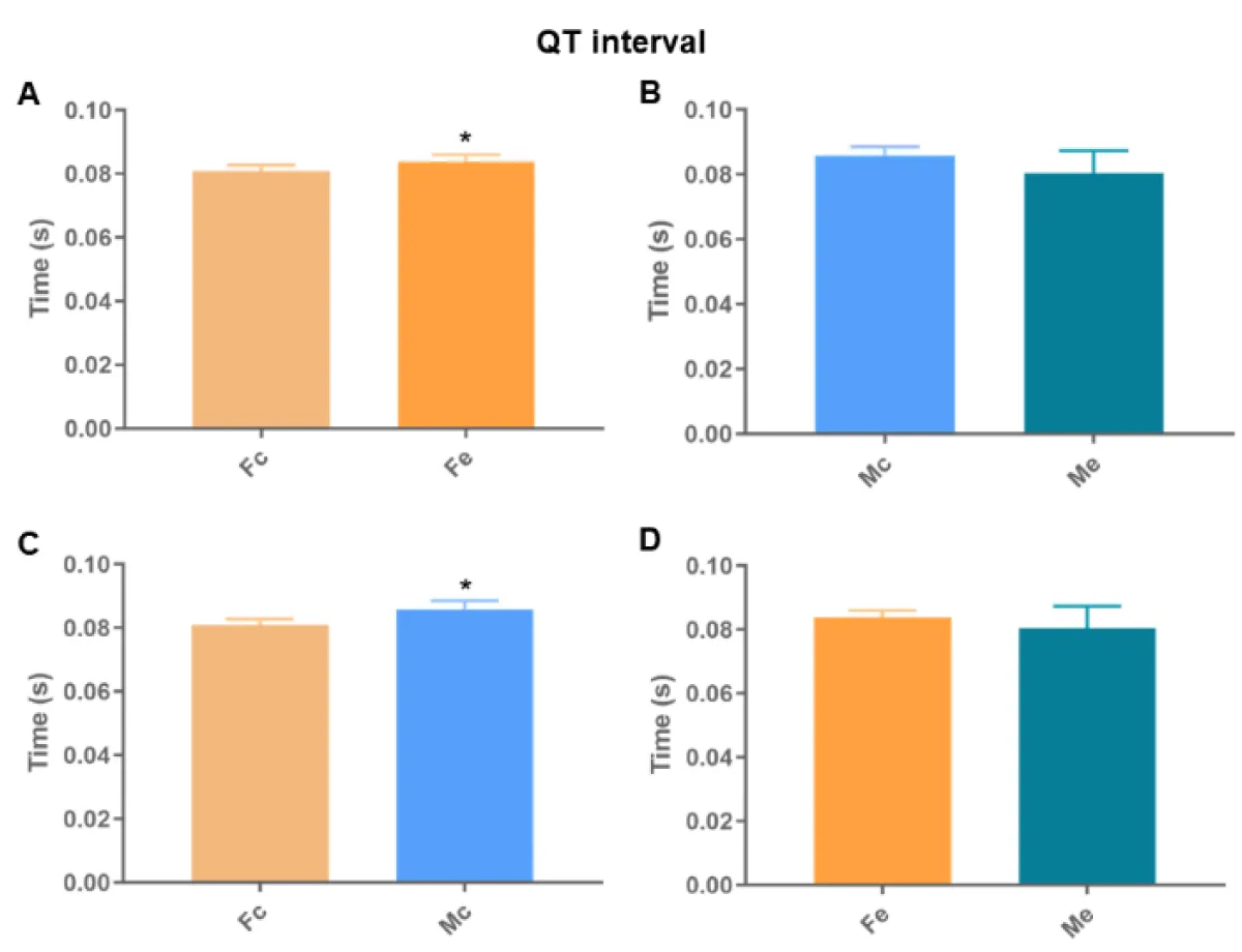 We found differences between the Fc and Fe groups in all analyses (Figures 6-8). We also identified differences in the QT interval comparing control groups. There was no difference in the remaining comparisons.