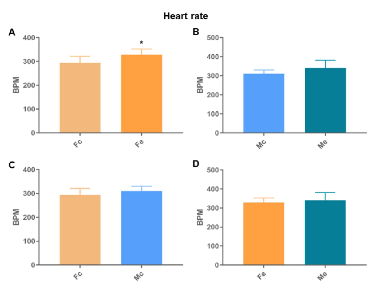 Figure 7: Heart rate. A: comparison between females; B: comparison between males; C: comparison between controls; D: comparison between exposed (p < 0.05*).