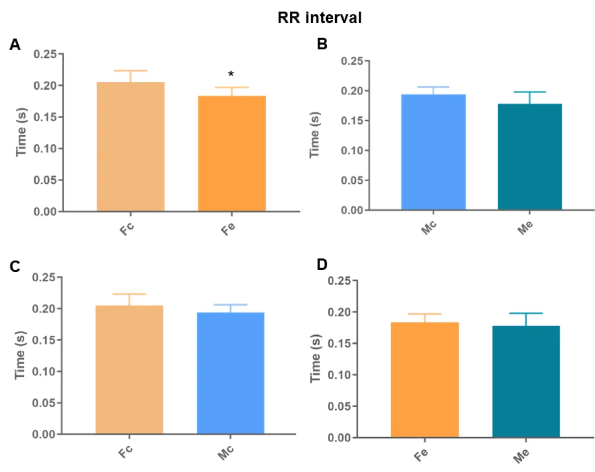 Figure 8: RR interval. A: comparison between females; B: comparison between males; C: comparison between controls; D: comparison between exposures (p < 0.05*).